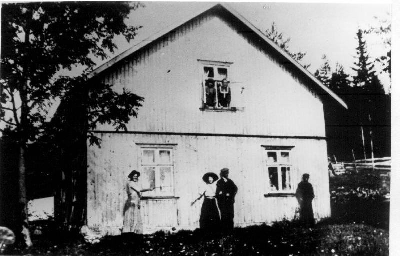 Fra v. Emma Gravdal ( Åsstuen) ,Theresa Moe, Martin Åsstuen, Karl Åsstuen, i vinduet i 2 etg.: Jørgen og Eli. Huset ligger opp for Andorsrud like innenfor Andorsrudbakken. Kjører opp ved kontorbygningen til Selvik bruk.