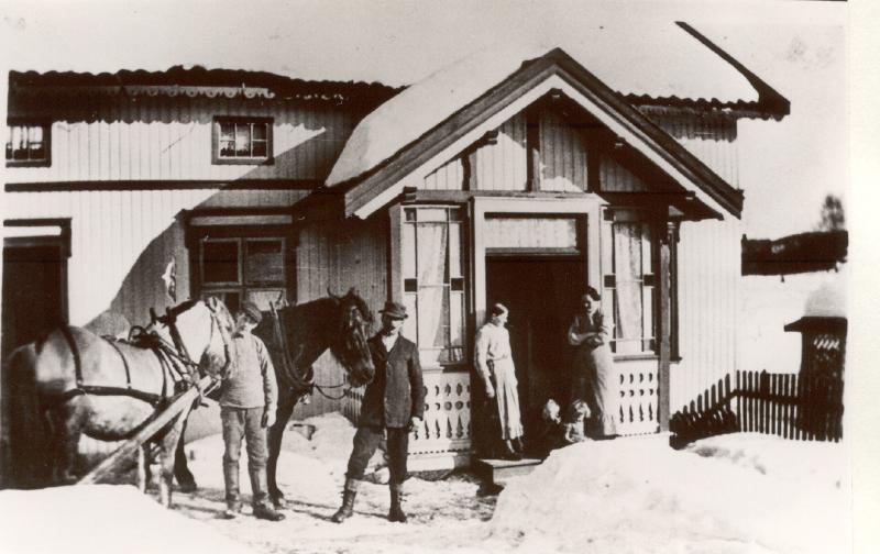 Foran huset en vinterdag. Fra v. Olaf Fjeld ( f 1887 ). Conrad Fjeld ( f.1879 ). Berthea Fjeld ( f. 1847 ) Astri Andersen gift med Conrad Fjeld ( Hun er søster av Marie Hamsun (kona til Knut Hamsun) , De to små barna er fra venstre. Kai Fjell og Gjertrud Fjeld (Lillemor)