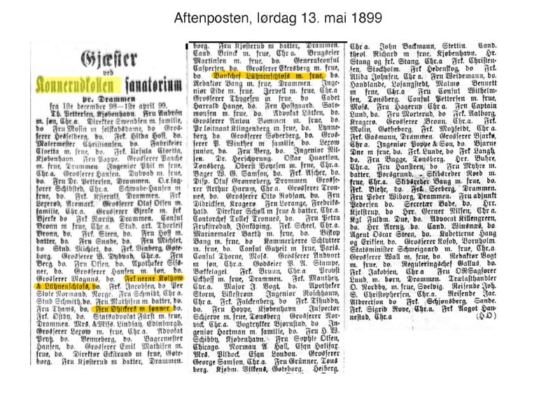 Artikkel i Aftenposten lørdag 13. mai 1899. Liste over gjester ved Konnerudkolen Sanatorium i perioden 1. desember 1998 til 1. april 1899. Dokument er utlånt fra Harald Øhlckers. Hans oldemor med sønner er med i listen over gjester. Fru Øhlckers med sønner er Harald Øhlckers oldemor - Fanny Elvira Øhlckers, hans bestefar - Conrad Alfred Øhlckers (1877) og bestefarens bror - Johan Bernhard Heinrich Øhlckers (1879).
