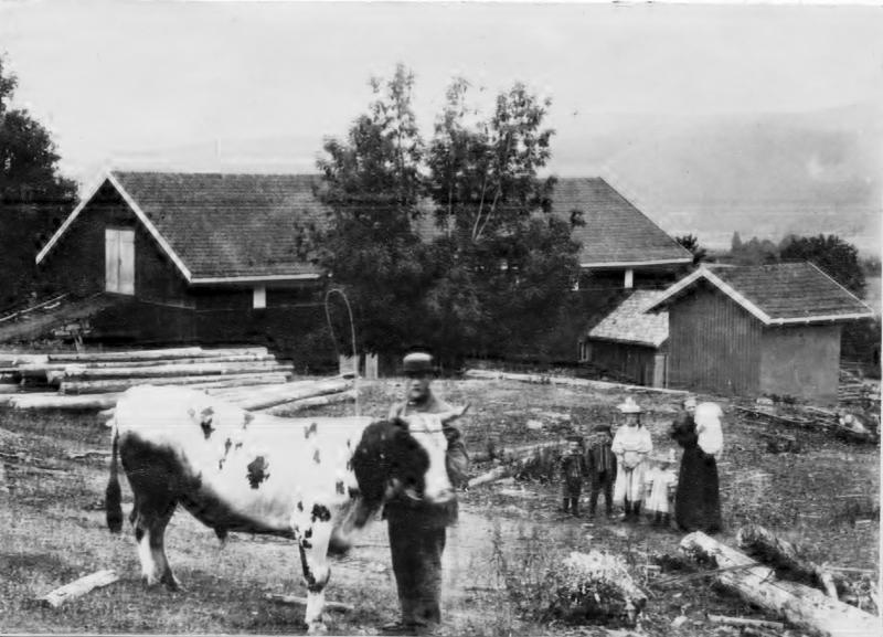 Bildet er tatt ca. 1895 og viser Jørgen Halvorsen Skjeldrum (1856 - 1911) (med oksen) og kona Hanna Marie (f. Gundersrød) (1857 - 1927) med fem av barna. Fra venstre bak: John (d. 1919), Halvor (Lindas bestefar), Helma Dorothea (senere gift med Anders Juel på Lindum), Karen Kristine og Hanna Marie med Jenny Marie (døde som barn) på armen.