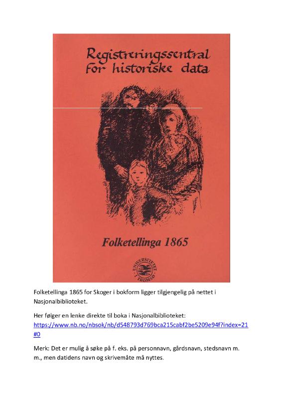 Folketellingen 1865 for Skoger er utgitt i bokform og er tilgjengelig på nettet hos Nasjonalbiblioteket. Her er en introduksjonsside med lenke direkte til boka i Nasjonalbiblioteket. Veiledning: Klikk «Last ned» orginalfila. Et avlangt vindu kommer opp nederst på skjermen (i Windows 10), klikk «Åpne» og pdf-fila åpnes på egen maskin. Under forsidebildet ligger ei blå lenke, klikk på denne fører til åpning av boka i Nasjonalbiblioteket. Klikk «OK» på varselet om opphavsrettigheter og det er klart for å søke eller bla i boka.
