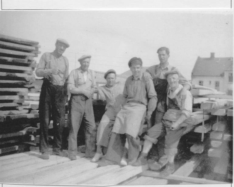 Bernås sag og høvleri. Fra v. - u - Erling Svensrud - Arvid Halvorsen - Arne Kaspersen ------- Sittende til h. klyvemester Willhelmsen