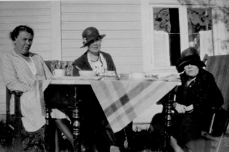Fra v. Hanna Hansen, Anne Christensen og Charm. Thollefsen. De to sise er fra Drammen og er på besøk i Hasselbakken