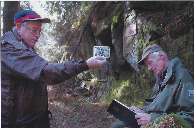 Tekst: Per Runar Thoresen Bildet tatt ved celle 2 okt 2007. 6-7 SKH medlemmer hadde en vandring for å oppdatere seg på celle. Per Runar Thoresen til venste og Tor Jahren studerer bilder og Vestskogjegernes Minnebok. Legg merke til metallskiltet på treet i balgrunnen. Ble satt opp etter krigen.
