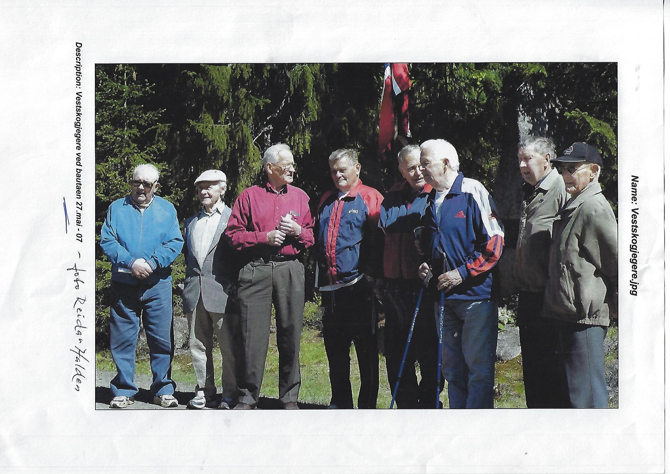 Tekst: Per Runar Thoresen Vestskojegernes minnedag 27 mai 2007. I midten på bildet står Fylkesmann Leif Haraldseth som holdt dagens tale. De øvrige er "gamle" Vestskogjegere.
