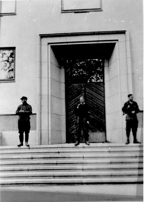 Frigjøringsdagen i mai 1945, vakter utenfor daverende Fylkeshuset, nå Drammen Bibliotek ( 1992)