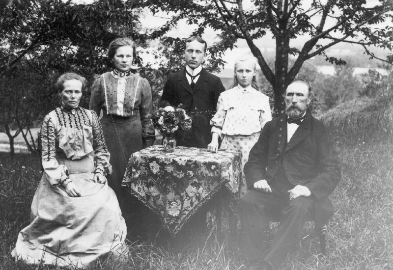 Pukerud, g.nr 2/2 Fra v: Bolette Andersdatter Egge f. 1856 d.1922 Berthe Johanne Egge f.1883 Harald C. Egge. f. 1887. Sjef på Strømsgodset komm. kontor Agnes Laura Egge f. 1893 Carl Hansen Egge f. 1853 d. 1918