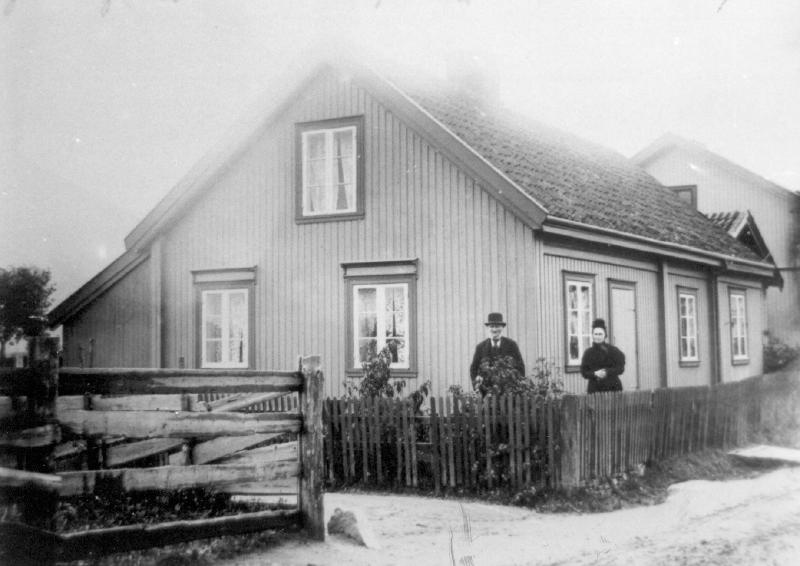 Hjørnet av Rødgt. Øvre Eikerv. Personene er snekker Lars Pedersen f. 1813 i Skoger, og hans frue Anne Larsdotter , f. 1822 på Konnerud. De eide huset på bildet. Ole Gram hadde kolonifor. her - senere overtok hans sønn Artur Gram. Huset i bakgrunn er Øvre Eikerv. 39. Det tilhørte Henrik Gulbrandsen. Hans sønnesønn Erling Gulbrandsen eier huset nu ( sept. 1987 )