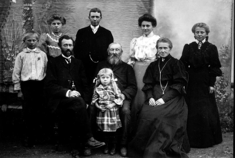 Øvre Eikerv. 59. Barnet foran er Lilly som døde i spanskesyken i 1918. Sittende: Kristisn Hansen Friise og Ole Andreasen, Aasen, f. 1820. Ola arb. på Blaafarveverket, Modum fra han var 12 år gammel. Hans datter Othilde Friise ,var et dyktig menneske. Hun vevet filleryer for folk langt opp i alderdommen. Sittende, fra v: Kari Amundsen f. Frisse, Svenda Friise, f. Friise (g.m. sin fetter Gulbrand Friise ) Svenda var i mange år med i formanskapet for Strømsgodset.