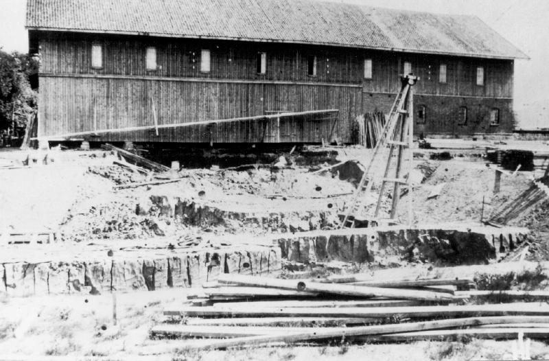 Fra bygging av lagerhus til Gulskogen Cellulose ca 1909 I bakgrunn : Uthuset på Lillemoen gård