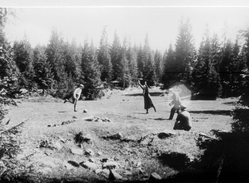 Måsabekkvollen. fra v. Toll Tollum, Marta Wium, Gulbrand Wium og Elise Jensen f. Wium. I forgrunnen den gamle boplasse " Hustuft"