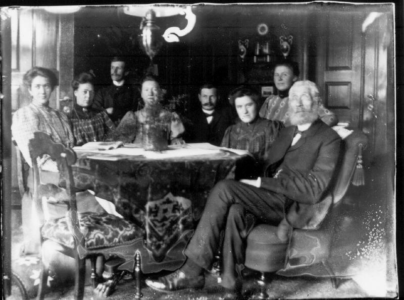 I Dagligistuen på Stormoen. Aagot, frk. Øvre, Ingvald, Odbjørg Linseth, Gustav Vammen , Gurine Linseth, Elisabeth Bjerknes og far