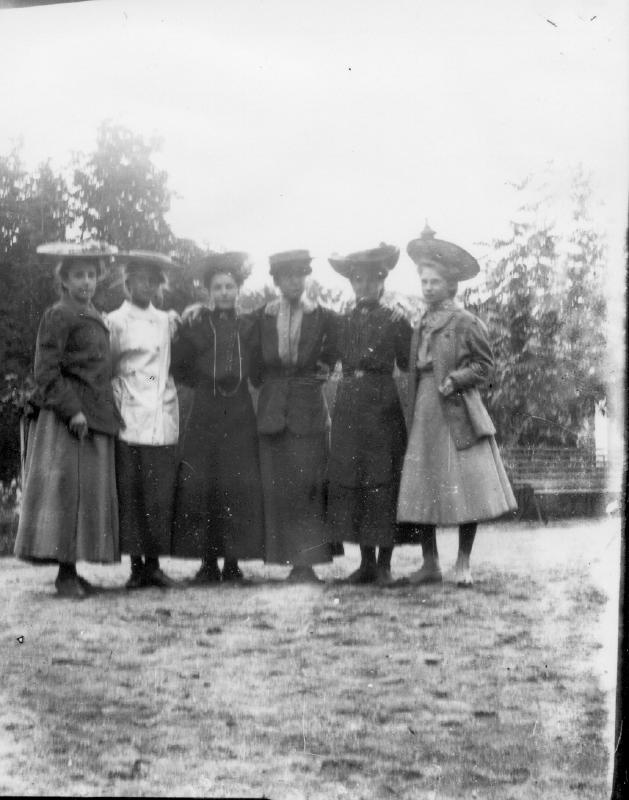 I Parken : Astrid Bergqvist, Margit Fris, Linken Nilsen, Ruth Backstad, Solveig Olsen, Dagny Backer. Bolde er tatt i okt. 1906
