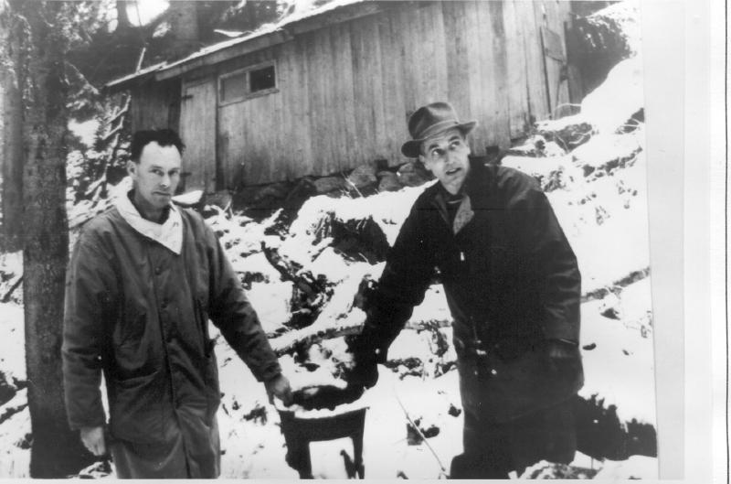 Det er gått noen år siden " gutta" forlot disse cellene. Fra v. Kåre Kind og Hans Halden. De er tilbake ved cella, hvor kamuflasjen nå har råtnet ned