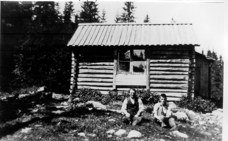 Jakthytta på Gravdalsåsen. Ca 200 meter vest for Gravdal, den ble sener flyttet til Gutudalen. Fra v. Oskar Lundby, Andreas Kaspersen