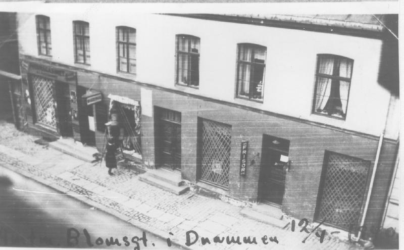 Bildet er tatt fra Wesmanngården ? Huset revet i 1984 - Nytt bygg ferdig høsten 1985. Forretning fra venstre: Fotomagasinet, Drammen Broderi og tegne. oppg, til 2 etage : Herrefrisør Thomassen