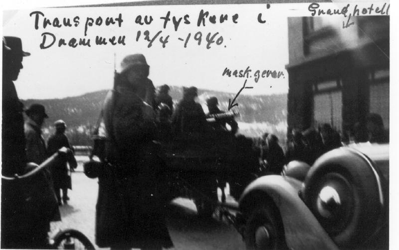 Transport av tyskere i Drammen. Bildet er tatt mot elven og til høyre Grand Hotel, nå revet. Kreditkassen holder til der ( 1985 )
