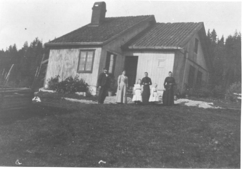 Fra v. Anders og Hanna Dheli, Ingrid Thomasen, Oline Hansen Veien, Asta Thomasen og Mathilde Hansen Veien. Midtiveien ligger opp fra Tveten / Holmrn