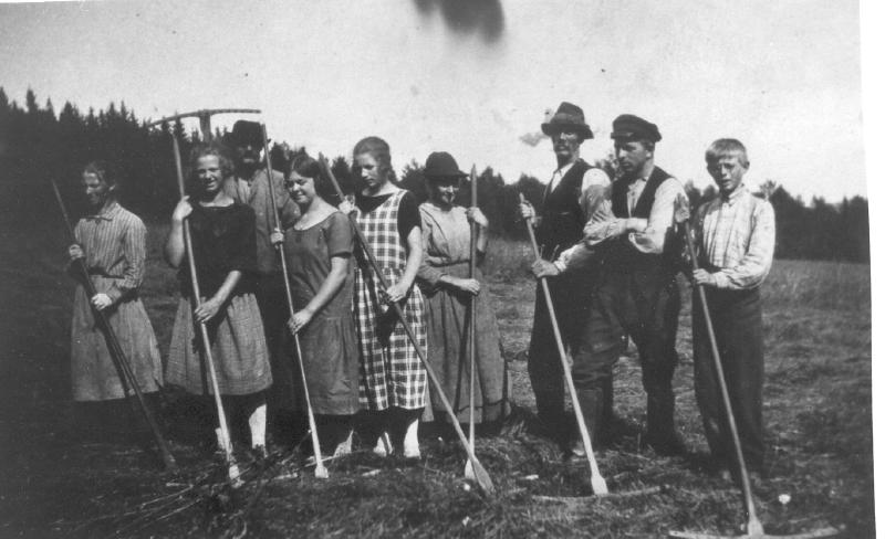 Høyonn på Stubberud. Fra v. Johanne og Martha Stubberud, Jørgen Dalen, Margit Lie, Jenny Stubberud, Jørgine Dahlen, Anton Syubberud, Olaf og Jens Dahlen