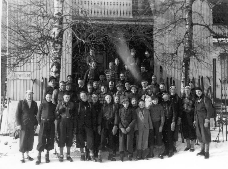 Vi tror bildet er tatt foran Stordammen Pensjonat.. På høyre flanke står 2 gutter med "Birrger Ruud" lue og like selbuvotter. Den yngste foran er Torstein Bjerkeseth f. 1924 og bak han Arne Georg Bjerkeseth f. 1922. Etter alder å dømme på guttene kan bildet være tatt like før 2. verdenskrig.