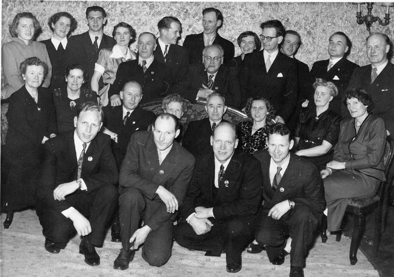 Bildet er fra 25 års jubileumsfesten i Harmonien 8. mars 1952 Nesten 100 medlemmer og innbudte gjester var tilstede. Blandt gjestene ser vi Ordfører i Skoger Kommune Einar Aas samt repr. fra krets og særkretser. Foran til venstre vår ol-deltaker i alpint Jonny Lunde og to brødre Pettersvold med Harald Wisting mellom seg. Midt på bildet med sigaren feiermester Axel M. Amundsen og litt til venstre for han står veteranen Tollef Nilsen.