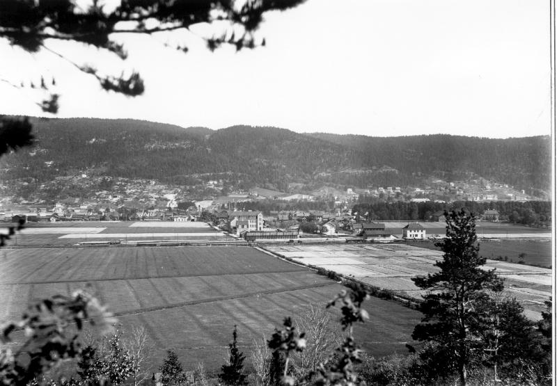 Rødskog skole midt på bildet. Den var ferdig bygget i 1916. Hvit bygning til v. for furua er Gulskogen stasjon. Til h. for furua ser en Gulskogen gård