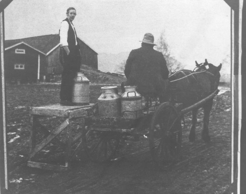 Melkekjøring i gamle dager. Konstruert bilde - norske meierier 100 år i 1981. Personene på bildet er Jørgen Juel på kjerra og Hans Jørgen Juel på melkerampa på Kniveveien.Staburet og deler av låven på Knive i bakgrunn.