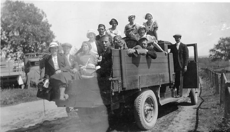 Skoger Ungdomslag på tur til Vestfold ungdomsfylking i Borre. Bilen tilhører Olaf Pedersen (Persan). Fra v.: Steen, John Johnsen, Aslaug Unelsrød gift med John Johnsen,Gudrun Husum, ?, Thorleif Unelsrød, ?, Gerd Nina Huseby (gift Boman), Ester Husum, ?, gårdsgutt på Skjeldrum (navn ukjent), Inger Johanne Hodt (f. Kristiansen), Ester Lunde Berntsen (f.Amundsen), Rolf Pettersvold, Gunhild Sandland, (gift med Thorleif Pettersvold og mor til Svein og Guro Pettersvold) og Erling Amundsen.
