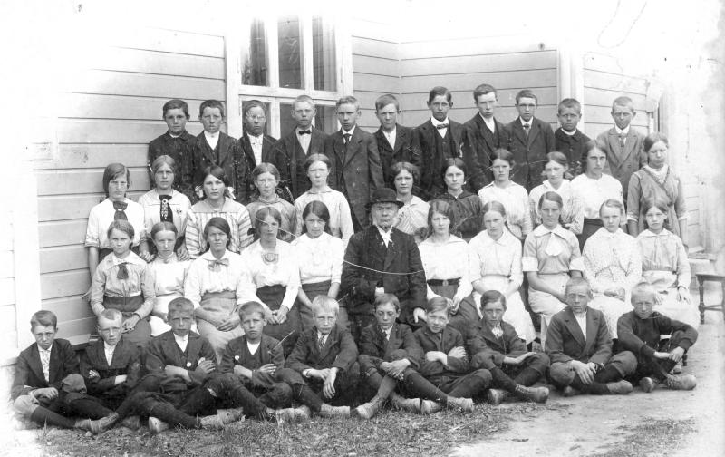 Antagelig konfirmanter fotografert utenfor Skogvang. Kan noen hjelpe oss med flere oppplysninger? Presten er Peder Olsen Megrund , 22.04.1840 - 18.06.1929, Prest fra 1893 - 1918