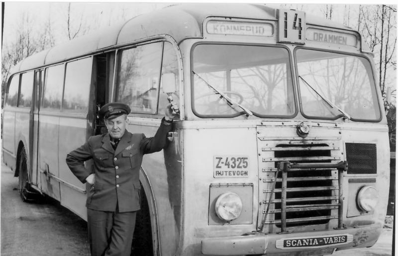 Ragnar Fåberg foran bussen mellom Drammen og Konnerud som var eid og ble drevet av SH Busslinjer. (Svein Helling Busslinjer)