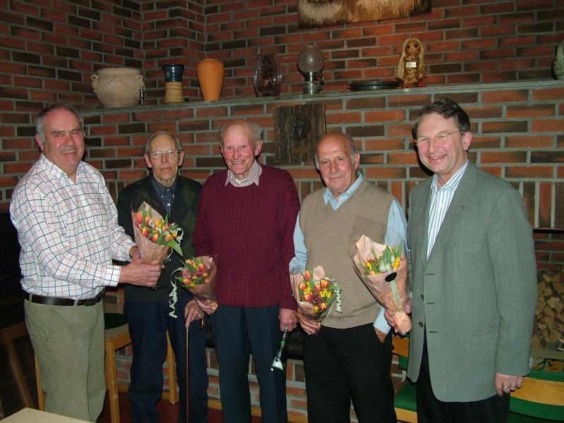 Fra Årsmøtet på Sørvangen. Ole Kristian Mortensen hedrer sagveteranene fra v.: Harald Johansen (Springover) ( 87 år) og Jørgen Skjeldrum ( 82 år) for sin innsats med filmen om Skjeldrumsaga. Videre Hans Austad og Pål Carelson fikk takk for bidraget fra Tømmerkjøpernes Fond til restaurering av Skjeldrumsaga ( kr. 40.000)