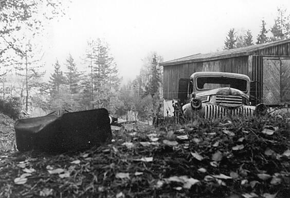Lagerbygning v/ Verkenselva (fossen ). Bilen på bildet er en Chevrolet 1946-47 modell.