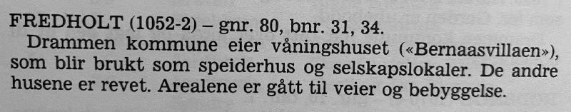 I Skogerboka av 1931 står det : Fredholt ble bygget som villa av farver Skramstad i Drammen. Stedet er senere gått over til fru Karoline Moe, som driver et populært bevertningssted der, og som bestyrer Konnerud Telefoncentral som er installert der. Det sto tidligere en gammel stue her, som kaltes «Kammakerhusa» og minnet om en tidligere eiers håndverk. Fra Drammen Byleksikon : Bruk utskilt fra Ekholt på Konnerud (bnr. 31), oppr. bygget som villa av farger Skramstad i Drammen. Stedet ble i 1917 overtatt av Karoline Amalie Moe som frem til annen halvdel av 1930-årene drev et populært bevertningssted på eiendommen, som også huset Konnerud Telefoncentral med fru Moe som bestyrer. Tidligere sto en gammel stue, Kammakerhusa, her, som trolig hadde navn etter eierens yrke. Kammakerne var en liten håndverkergruppe som bare holdt til i de større byene hvor de kunne få avsatt sine produkter, som de laget av horn og ben. Kammakeren på Konnerud solgte trolig sine varer i Drammensbyene. Eiendommen ble i 1961 solgt til Jacob Landsvik som tok imot psykiatriske pasienter, senere ble eiendommen tatt i bruk som sykehjem (bo- og servicesenter) under navnet Fredholt bo- og servicesenter (Gamleveien 9), med plass til 35 eldre pensjonærer. Etter en utvidelse i 1970 fikk Fredholt en gulvflate på ca. 1.800 kvm.