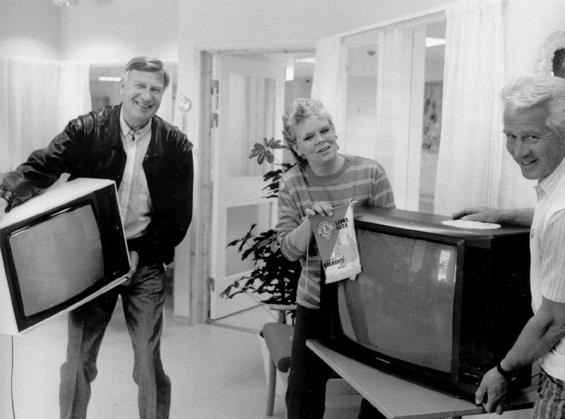 Lions Club overrekker et TV til dagligstua på det nye sykehjemmet. Fra bv. Helge Dammen - bestyrerinne Toril Naper Hauge og Tom Hayden