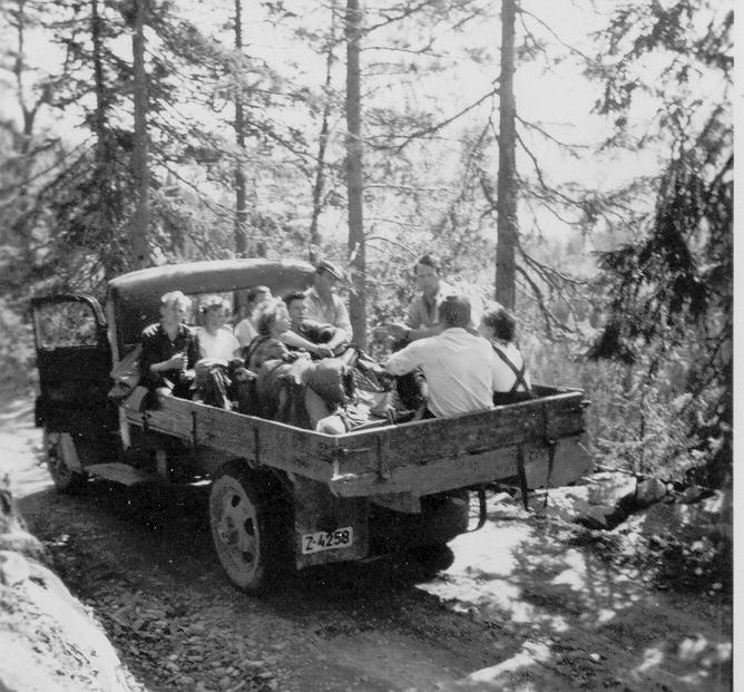 Gunnar Prøis fikk denne Ford lastebilen etter krigen. Den hadde stått gjemt på en låve . Her er Gunnar Prøis med venner på vei mot store Gravdalstjern.