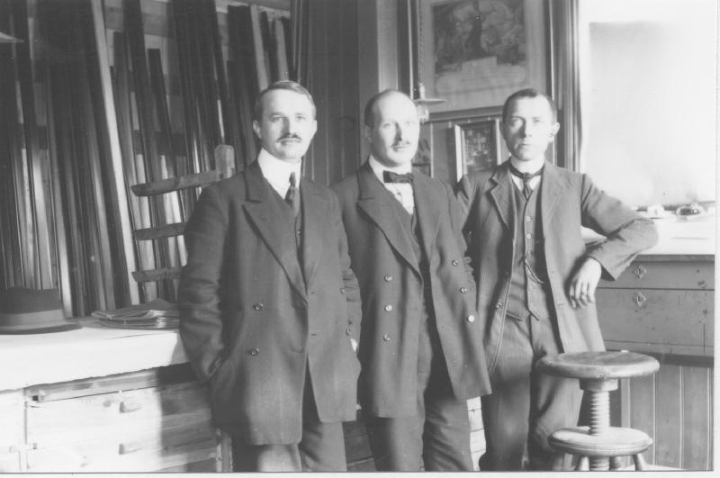 På kontoret fra v. Aksel R. Brenna. Ole J. Bugge, Olaus Johnsen. Bugge var kontorsjef fra 1912. Johnsen var verksmester. Brenna og Johnsen startet egen bdrift. DRAMMEN GULDLISTFABRIKK I 1912