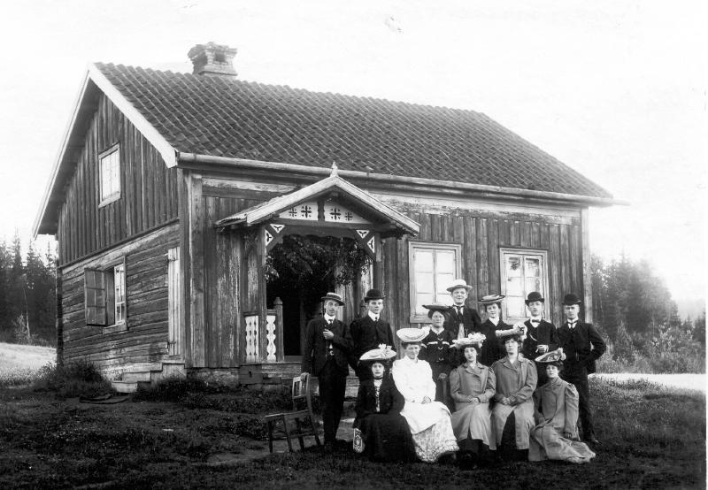 Hos Simen Langeland. Stående fra v. Hakon Hagen - Aleksander Pedersen ,død i Amerika. - Magnus Ellefsen, bror av Asbjørn Ellefsen - Thorvald Torgersen , Amerika. Christoffer Gulbrandsen, sønn av Knut Sittende. til v: Betzy Moen, mor til Edvard Moen