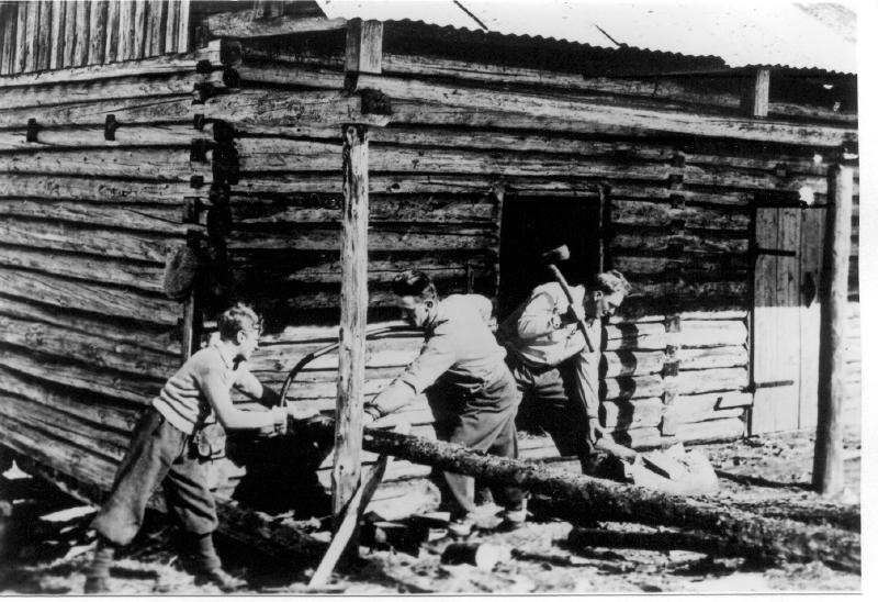 Vedhogst. Fra v. Helge Furuvold, Olaf Haveråen, Harald Wisting