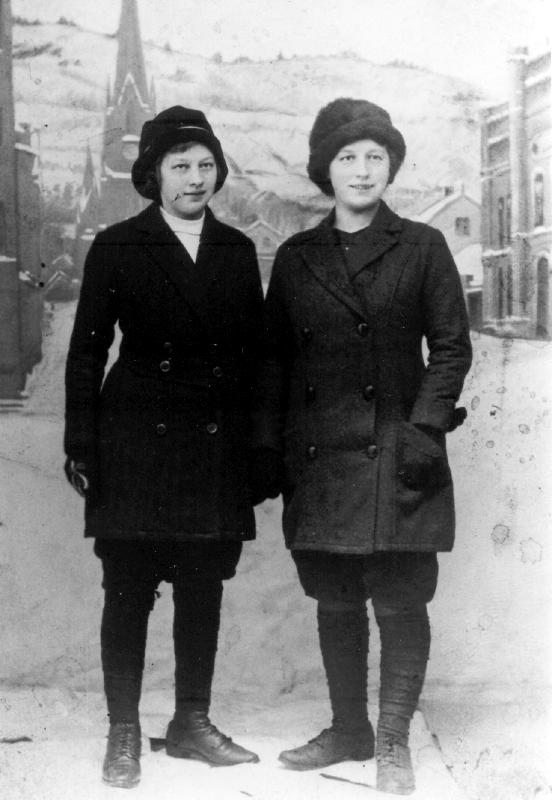 Søstrene Alma Johansen Springover ( Gomperud ) og Hilda Gomperud fra Konnerd i byen en vinterdag.