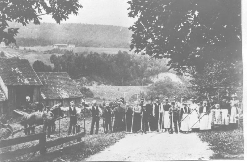 Plassen Engane under Store Solum. Låven er nå borte. Bare innhuset ( som ikke er med på bildet) står igjen. Esso- stasjonen ved E18 ligger her i dag Slåttelaget har tatt oppstilling for fotografering