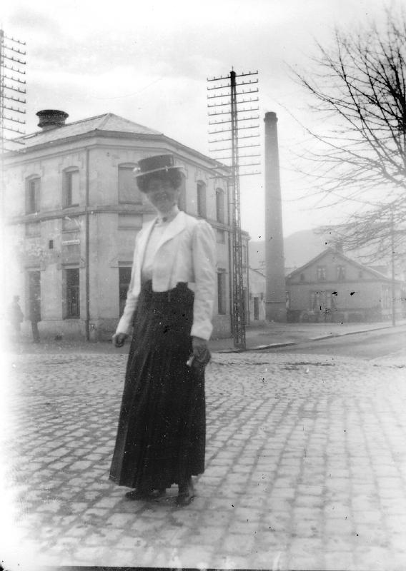 Grev Wedwls plass v/ Drammen komm. Bad Ingeborg Bjerknes står i gaten. ( Storgt. / Erik Børresens alle``)