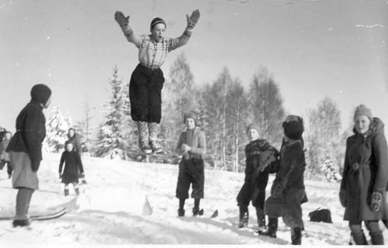 Skoleskirenn på Løvåsjordet. Til v.: Einar Dahler. i lufta: Oddvar Mortensen. Til høyre for hoppet : Arild Løvaald. Helt til h.: Ingjerd Hallerud f. Thorsberg.
