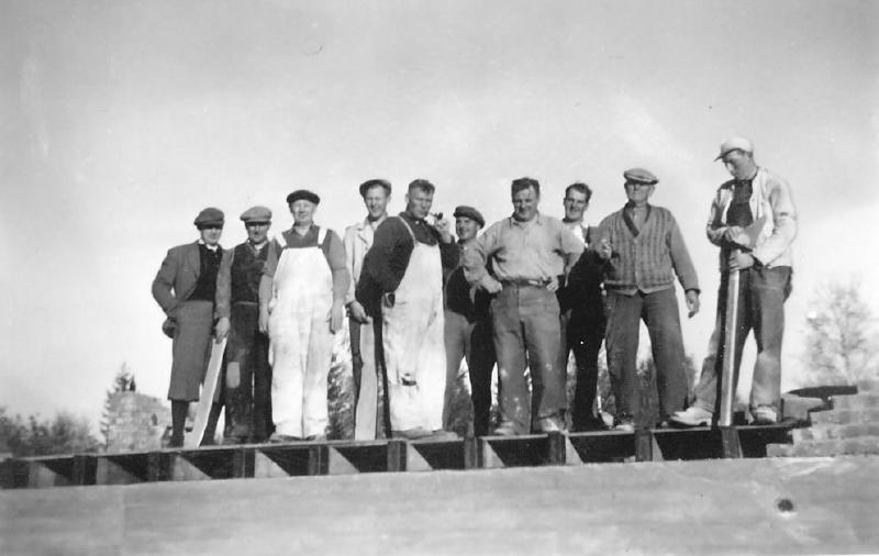 Arbeidslag som satte opp et hus på en dag. Fra v.: u. Ragnvald Larsen. Martinius Larsen. Rolf Bjerkeseth ( Larsen). Johan Kristiansen ( Veibrekk) . Gunnvald Larsen. Harald Larsen. Thorleif Larsen. Alfred Larsen. (Gamle mureren) Arne Bjerkseth ( Larsen )