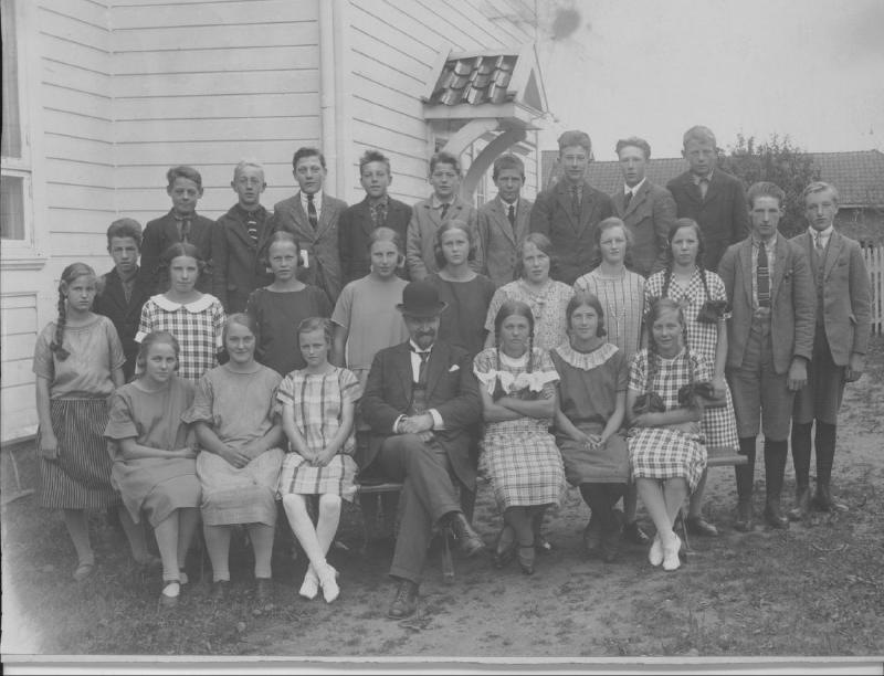 Konfirmasjonsbilde fra Skoger kirke i 1926, Steinar Torp skriver: Min mor Ilmi(?) Steen er blant konfirmantene sammen med (tvilling)søsteren Nora. Thorbjørn Berg (senere gift med Nora), Sagbakken er også med på bildet. Steinar Torp Munkerudveien 15 1163 Oslo