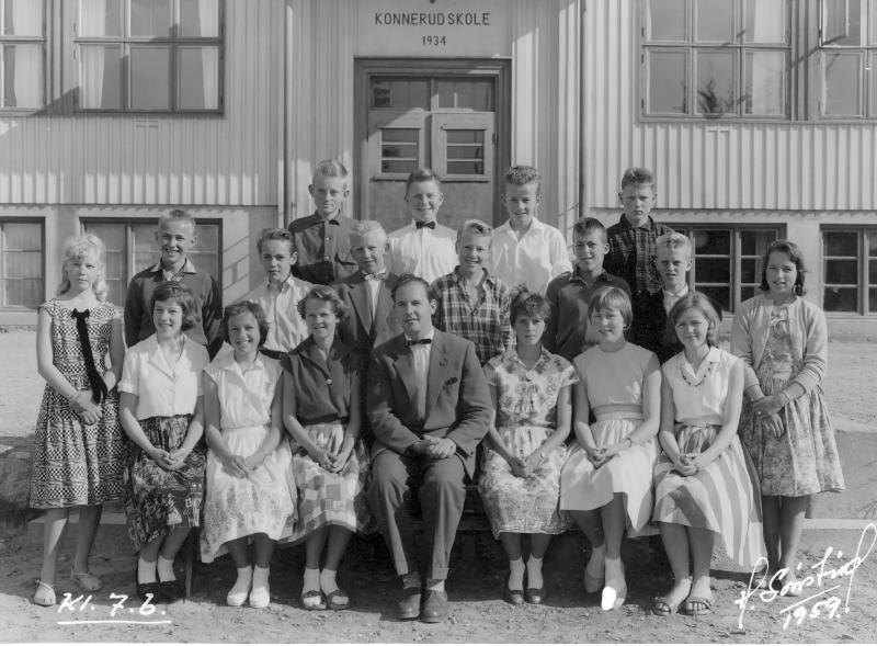 7.B 1959 (våren) Foran f.v. - sittende Aud Andersen, Grete Schulstad, Åse H. Lyhmann Blixrud, lærer Magne Harry Pettersen, Inger Teigen, Kari Borge, Inger Ragni Svendsrud. Stående 2.rekke f. v. Astri Tollefsen, Eigil Flaathen, Thor Egil Torgersen, Ole Åsmund Bernås, Jarle Andersen, Trond Øvre, Tor Edvind Veisten Johansen, Anniken Thue. Bakerste rekke f. v. Tore Lindset, Asbjørn Fagerhus, Tor Aksel Andreassen, Rolf Nyborg