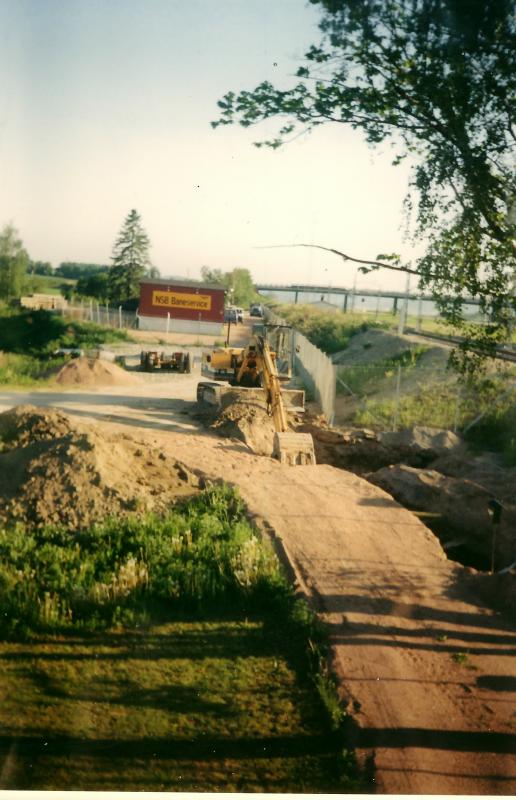 Arbeide i forbindelse med den nye motorveien ved Skoger stasjon som lå i bakkant av bildet. Brua over motorveien og jernbanen ses i bakgrunn. Den ligger i Sande.