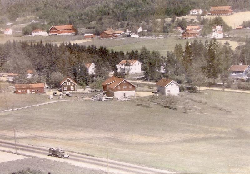 Gårdene i bakgrunnen ligger langs Lerpeveien. Gården øverst til høyre er Skalpe. På gården helt til venstre i boldet, Lerpe- ble det drevet med mye eggproduksjon på 1950-tallet.