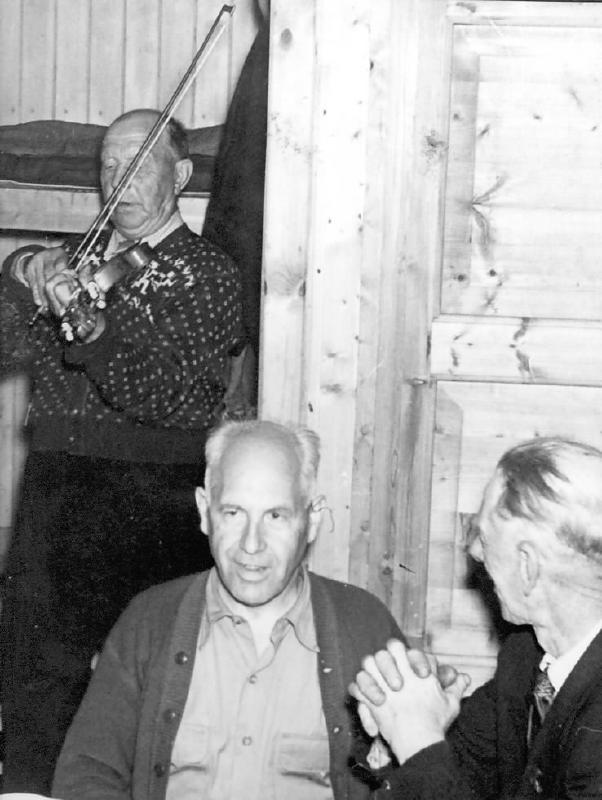 Alfred Stubberud med sin hardingfele. Ragnar Halden helt til høyre.