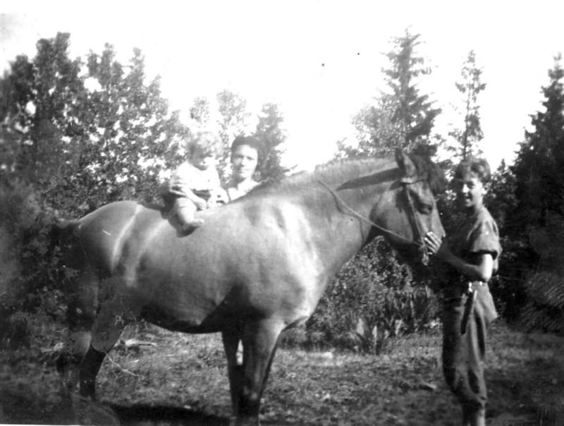 Det er Asta Johansen som holder sin lille sønn Kjell på hesteryggen. Han som holder hesten, er Gunnar Bjørnerud. Asta var gift ned Arthur Johansen, bror til Emil (far til fotografen Anne Berit Johansen). Asta og Arthur bodde i Sandbråten Sandbråten ligger nede ved Bremsa. Kjører forbi Westbye (ikke langt fra Skoger gamle kirke) for å komme dit.