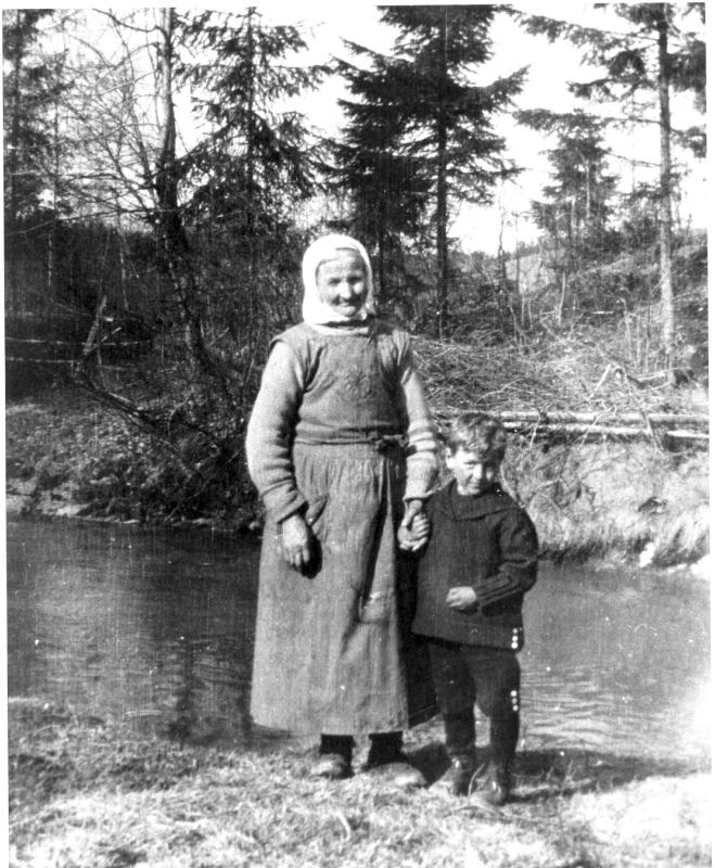 Bildet viser fru Bjørnerud og hennes dattersønn Gunnar. Mor til Gunnar, Margit, døde i ung alder og etterlot seg tre små barn. Mormoren tok seg av den eldste som var Gunnar. Far til Gunnar var en svenske som het Andrerson. Min far (skriver Anne Berit Johansen), Emil Johansen giftet seg med Margit i 1923 ?, og de fikk to barn, Trygve og Åse. Emil var enkemann i 15 år før han giftet seg igjen med Anette (f02.20.1901 - døde 1971) og fikk Anne Berit.